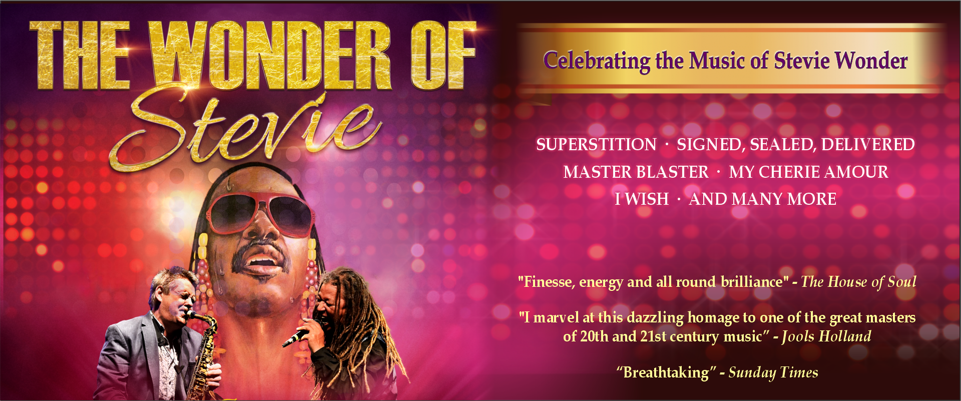 The Wonder of Stevie’s outstanding live band features musicians who have previously performed with a wide variety of music legends including Sir Rod Stewart, Bill Withers, Amy Winehouse, The Bee Gees, Eric Clapton, Sir Paul McCartney, David Gilmour, Nile Rodgers, Martha Reeves, Chaka Khan, Sam Moore, Jethro Tull, Eddie Floyd, Gregory Porter and Alfie Boe.